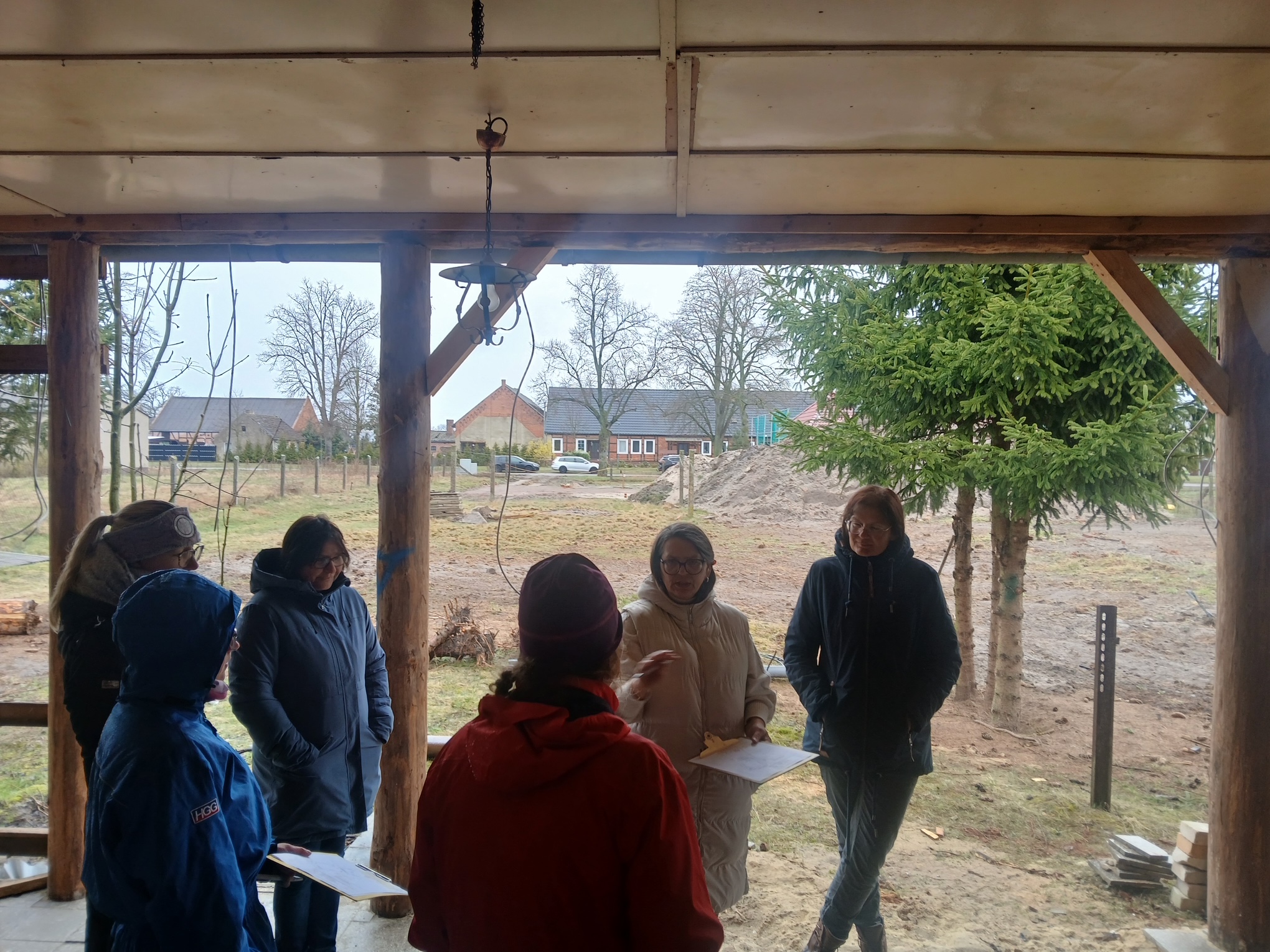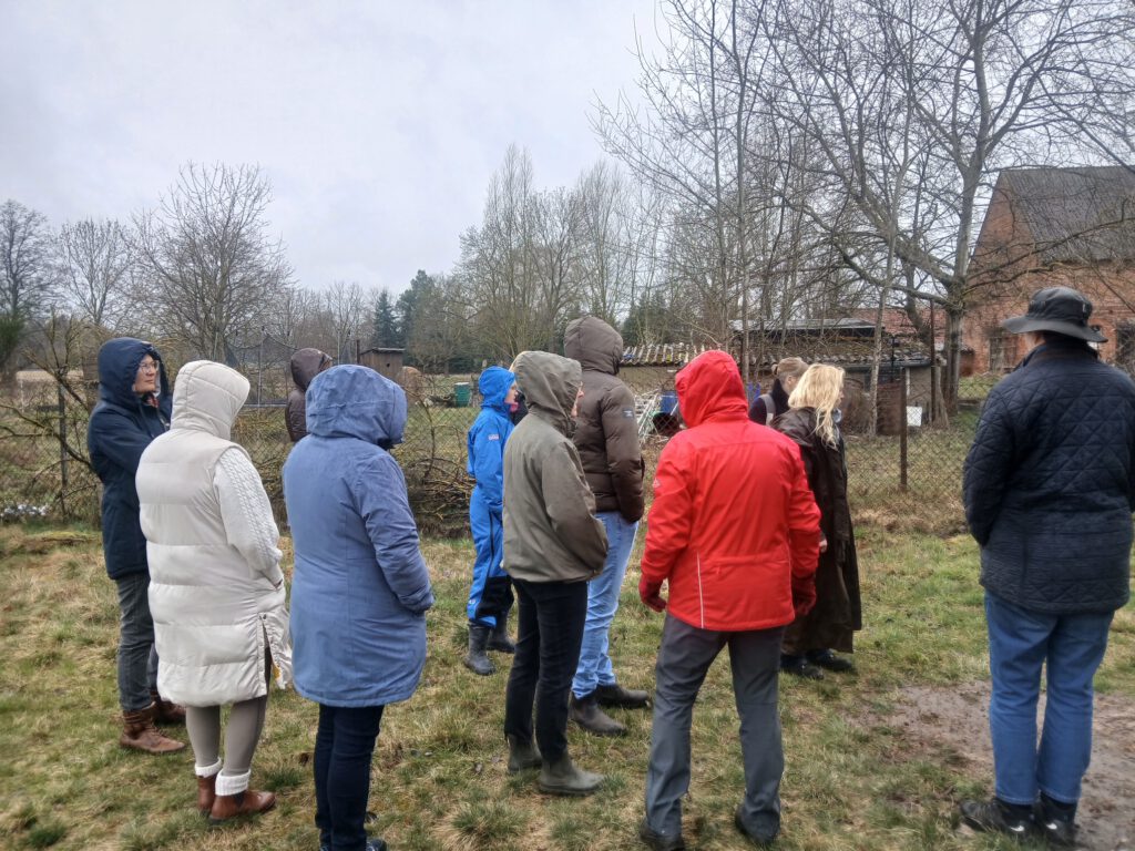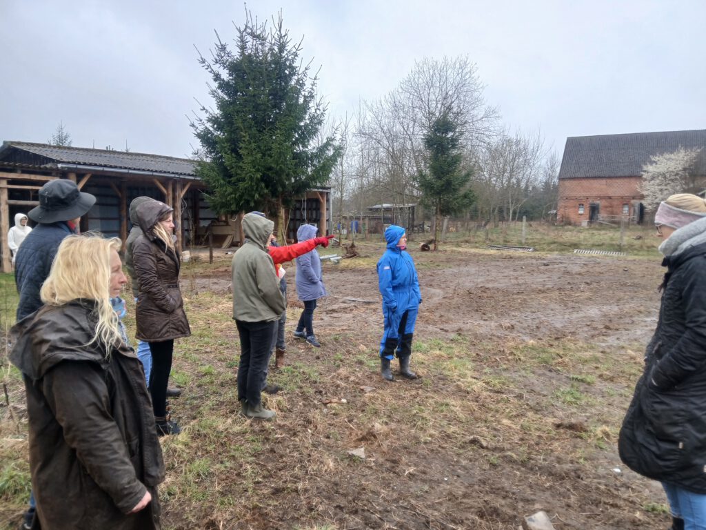 Nach der Theorie ging es raus an die Praxis: Auf einem realen Areals von etwa 1/2 ha mit bereits vorhandenen Wirtschaftsgebäuden, auf dem eine private Pferdehaltung geplant ist, konnten die Teilnehmer und Teilnehmerinnen ihr Wissen gleich anwenden. In Kleingruppen, ausgestattet mit Lageplan und Stiften, ging es ans Planen und Skizzieren. Am Ende lagen vier unterschiedliche Pläne vor, die von Verena noch fachlich kommentiert wurden. Die Besitzerin des Hofes hat nun die Qual der Wahl, sich für eines der Projekte zu entscheiden – oder Elemente aus jedem in ihre eigene Planung einfließen zu lassen.